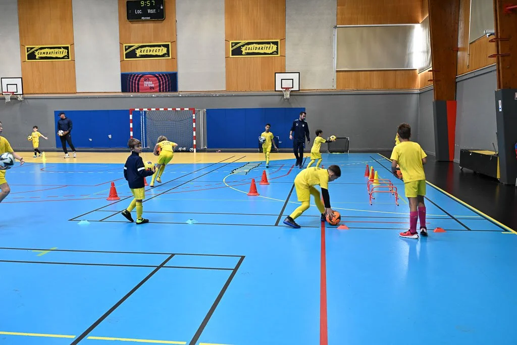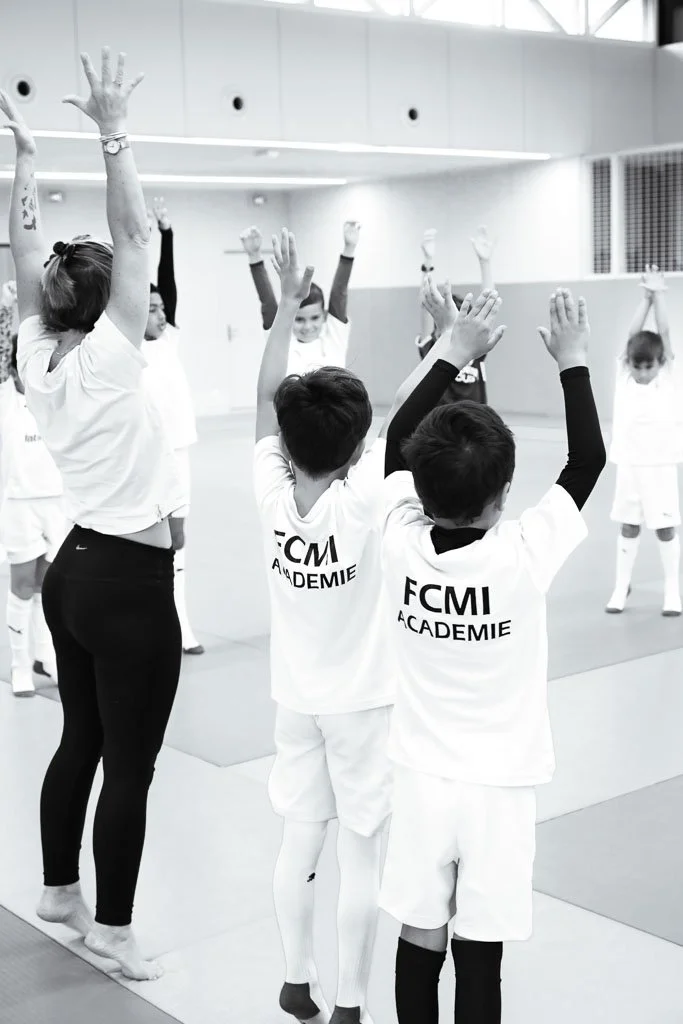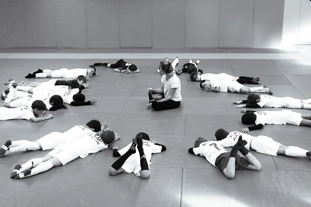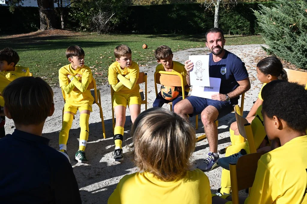 Au-delà du football, les images mettent en lumière les ateliers complémentaires proposés aux enfants, notamment le yoga et les ateliers de philosophie, afin de refléter une approche éducative complète et cohérente.
